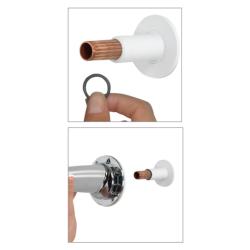 Designed to 'push fit' onto 15mm copper pipe through the wall. (at least 55mm-150mm of copper pipe needs to be exposed from the finished wall surface)