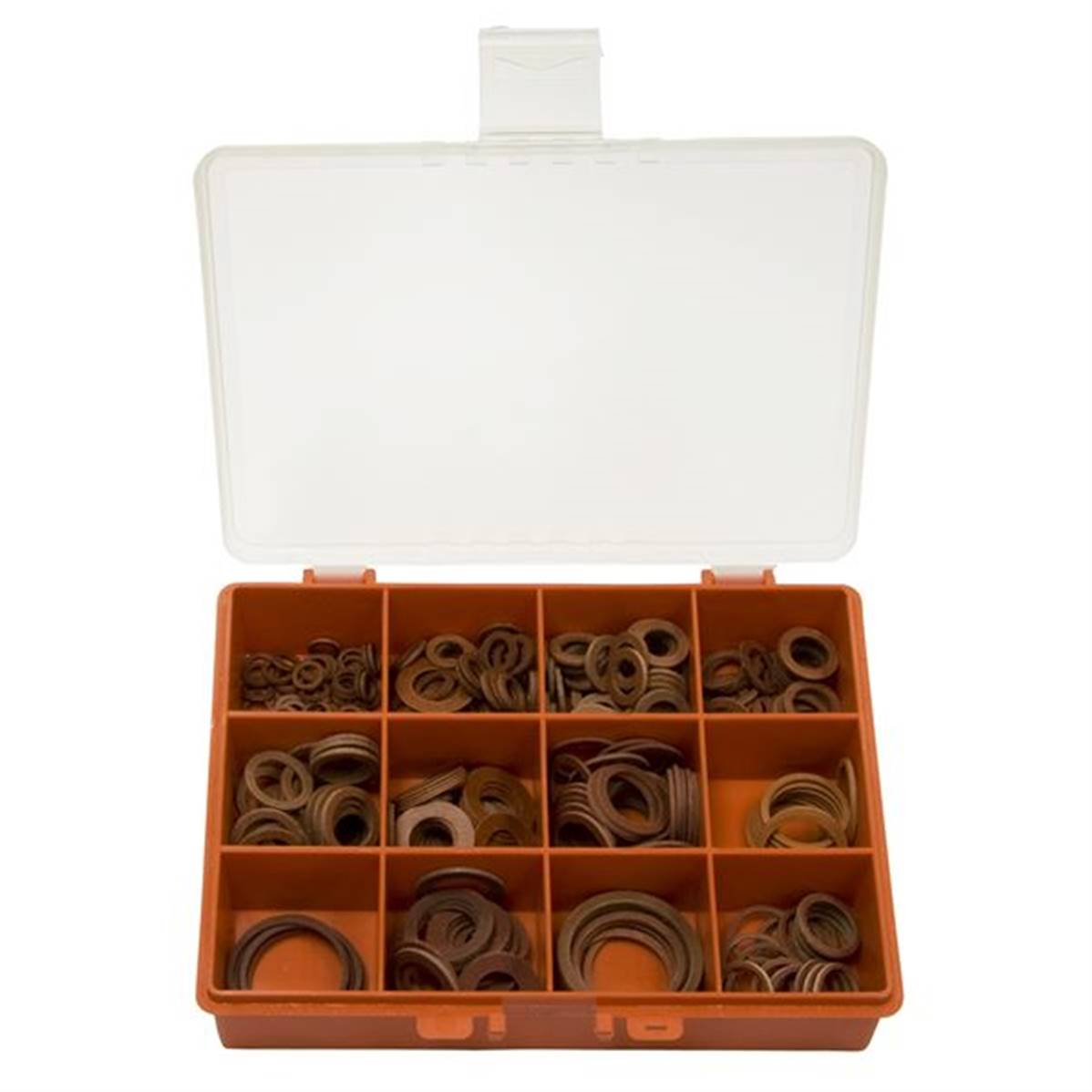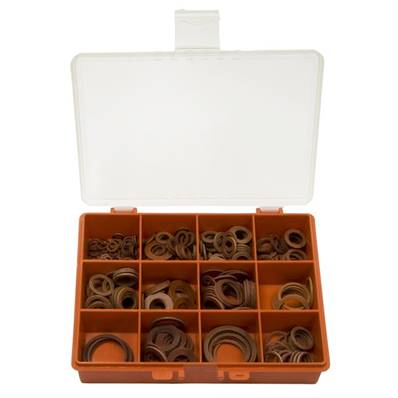 Fibre Washer Kit containing 330 pieces with the most commonly used sizes, stored neatly in handy carry case with a snap-lock lid.