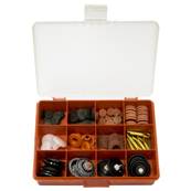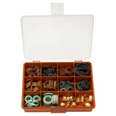 Fire & Rubber Washer Kit containing 210 pieces with 9 of the most commonly used sizes, stored neatly in handy carry case with a snap-lock lid.