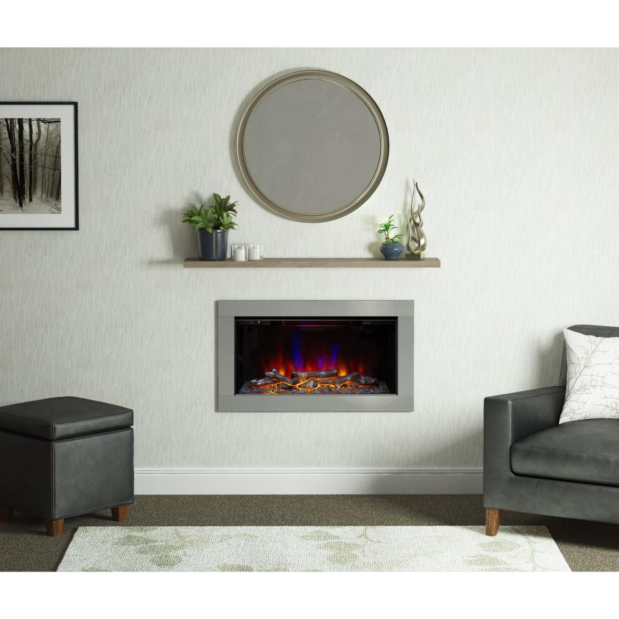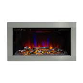 2kW inset wall mounted electric fire with 4 sided trim in Brushed Steel with realistic glowing log bed. The Be Modern Avella will add a striking, modern feature to any room. An inset electric fire designed to be recessed raised up in the wall, its a popular choice for those wanting to fit a TV above or build into a custom media wall.