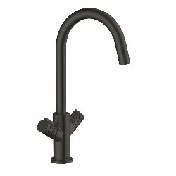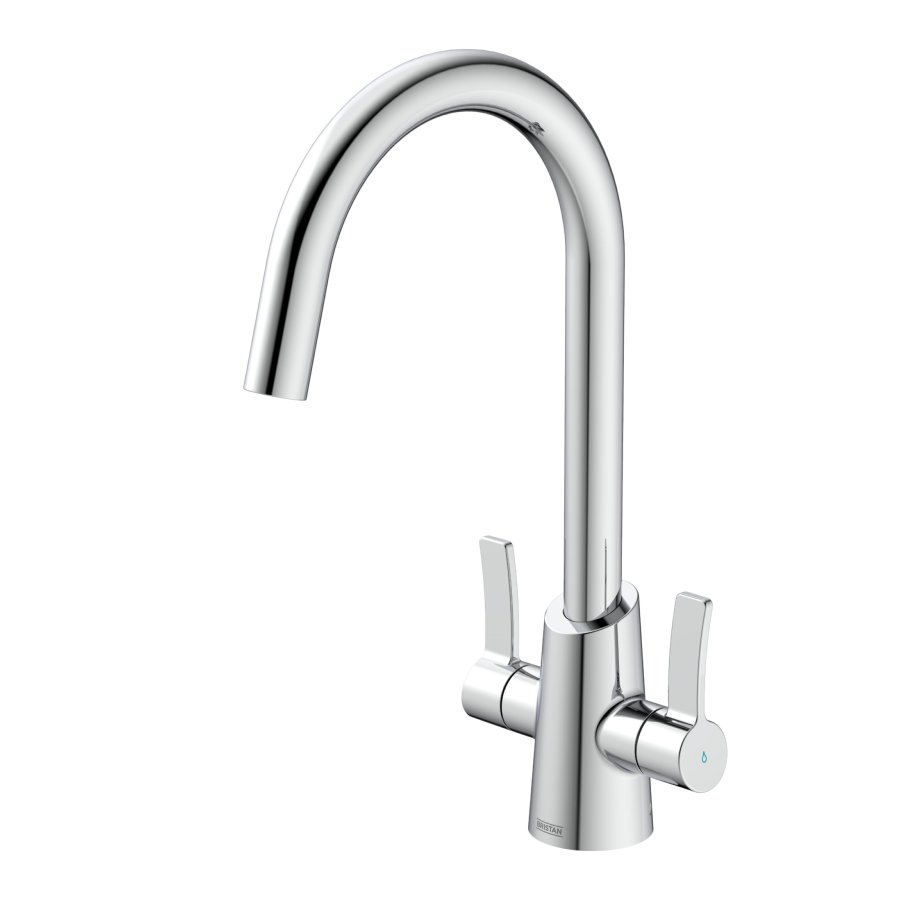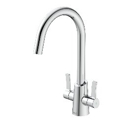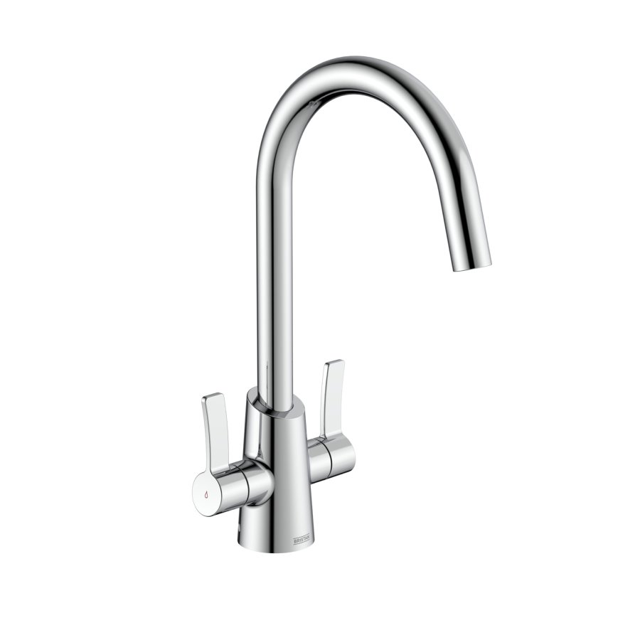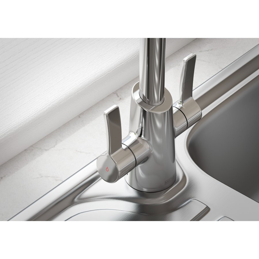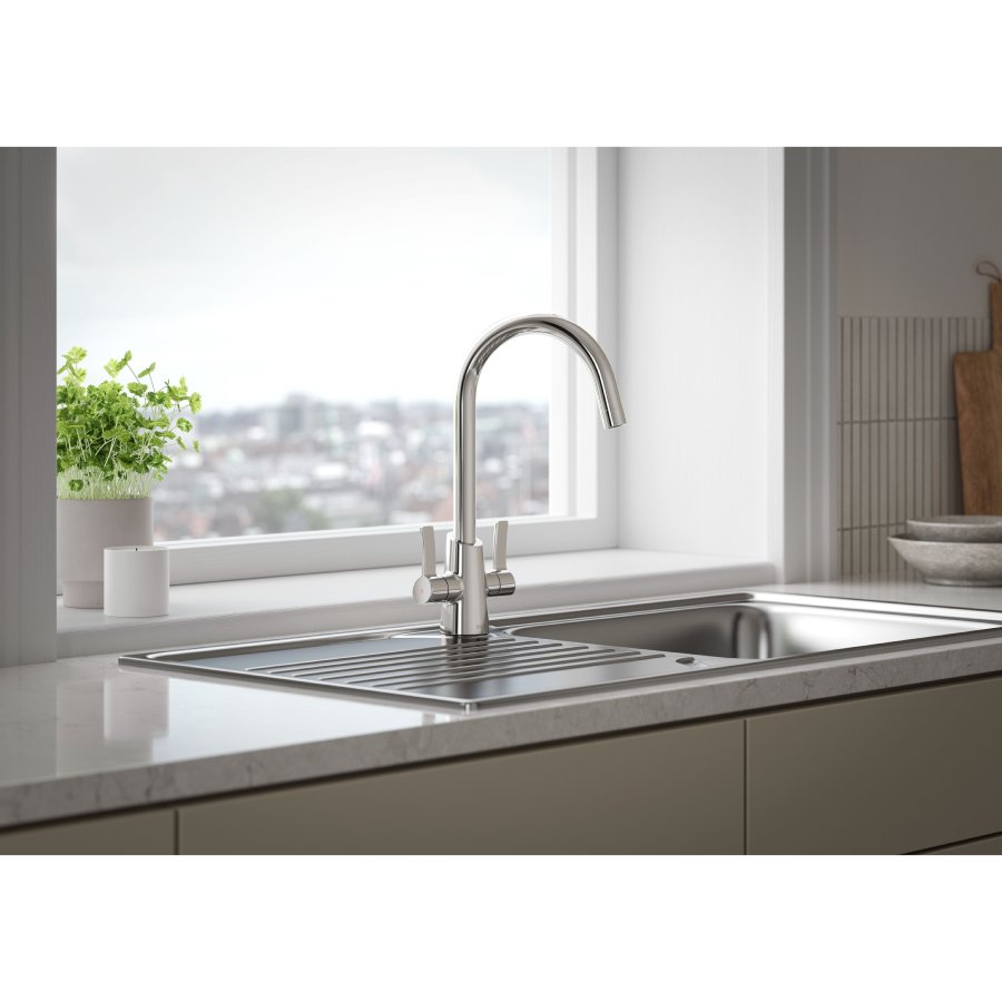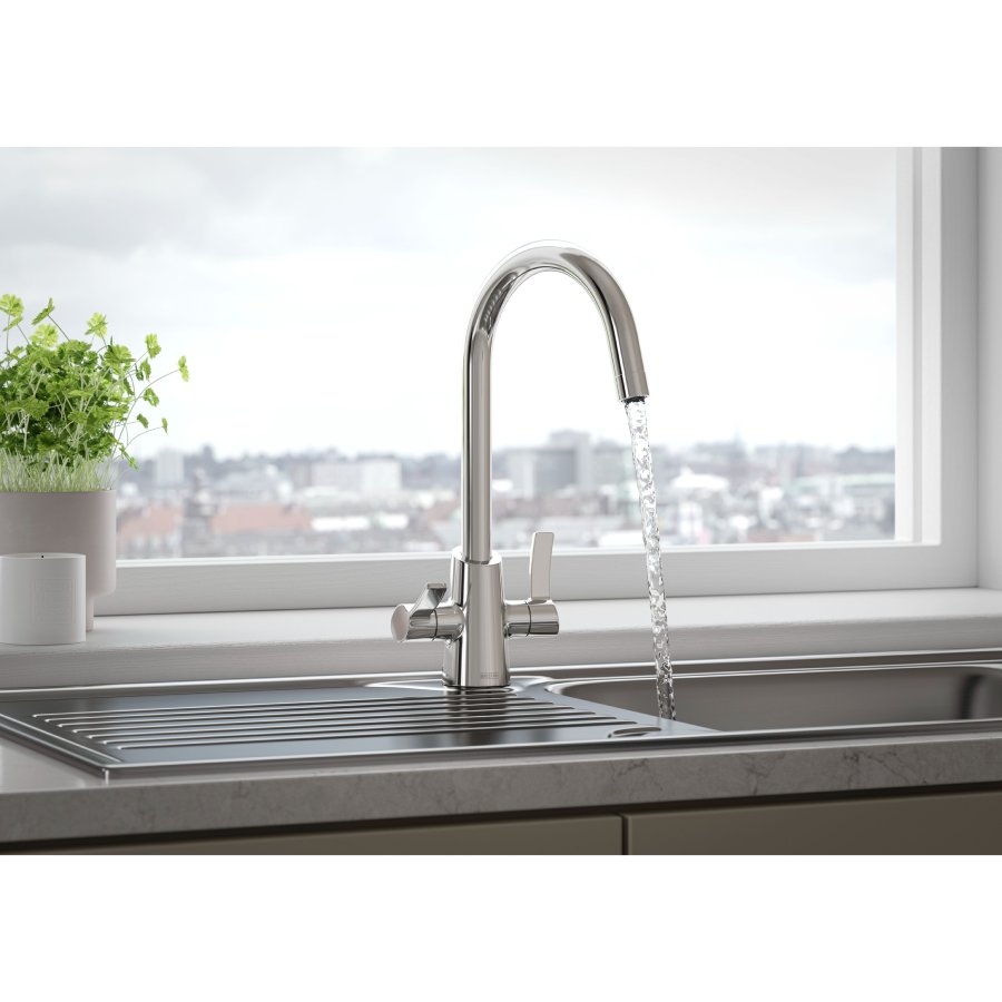 A contemporary twin lever kitchen tap featuring Top Fix Easyfit technology.