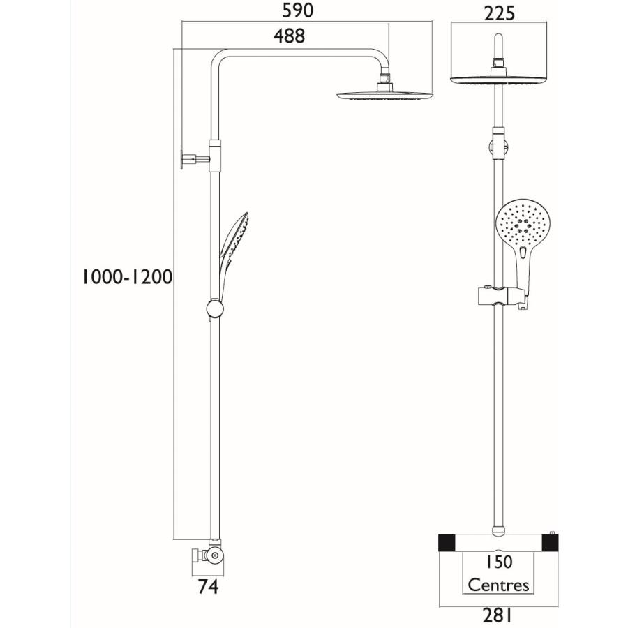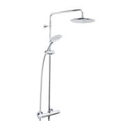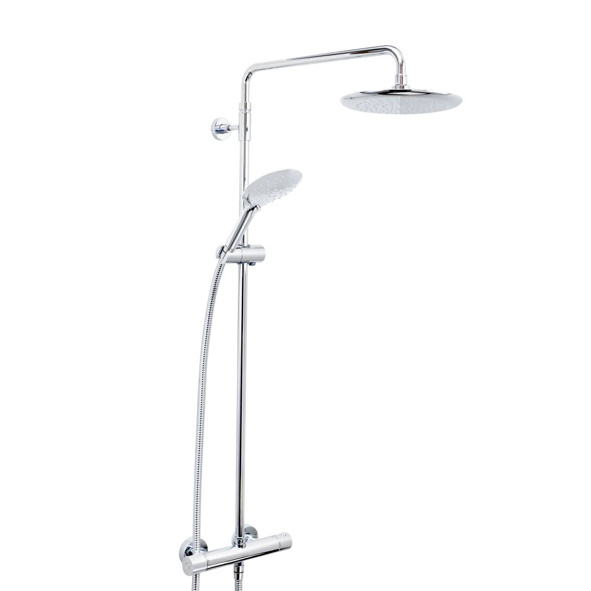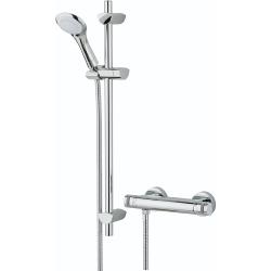 The shower comes with a thermostatic cartridge with a preset temperature stop at 38°C, can be over-ridden to a maximum of 46°C. It also provides an automatic shut-off in the event of hot or cold water supply failure. It has been designed with a telescopic rigid riser for adjustable height.