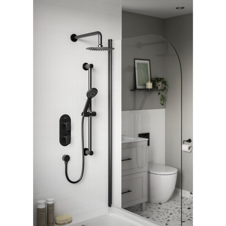 Introducing the Bristan Hourglass Black Concealed Dual Control Shower Pack, the ultimate combination of style and functionality for your shower needs. With its sleek design and innovative features, this shower pack is sure to elevate your bathroom experience to new heights. At the heart of this shower pack is the recessed shower valve with a two-way diverter, allowing you to effortlessly switch between the luxurious drench head and the convenient handset. Say goodbye to boring showers and hello to customizable spray patterns and pressure. Speaking of the drench head, the slimline 200mm circular design with a shower arm is not only aesthetically pleasing but also delivers an indulgent rainfall-like experience. Imagine stepping into your shower and being instantly enveloped in a cascade of warm water, washing away the stresses of the day. But that's not all. The shower kit included in this pack boasts an adjustable riser rail, offering flexibility in positioning the multifunction handset to suit your height and preferences. Whether you prefer a gentle spray or a more invigorating massage, this shower kit has you covered. Cleaning and maintenance are a breeze with the rub-clean design of both the handset and drench head. Say goodbye to limescale and dirt build-up and hello to a pristine shower experience every time. Simply wipe away any impurities, and you're good to go. Inspired by contemporary design trends, this shower pack is finished in fashionable matte black, adding a touch of sophistication to any bathroom decor. Its compact design allows it to fit into spaces as small as 35mm, making it ideal for both small and large bathrooms alike. When it comes to temperature and flow control, the dual control feature of this shower pack gives you the power to adjust your shower experience with precision. No more guessing or sudden temperature changes. Plus, with its front-accessible cartridge, any repairs or adjustments are a breeze, keeping your shower running smoothly for years to come. In summary, the Bristan Hourglass Black Concealed Dual Control Shower Pack is the perfect blend of style, functionality, and ease of use. Elevate your shower experience today and indulge in the luxury you deserve.