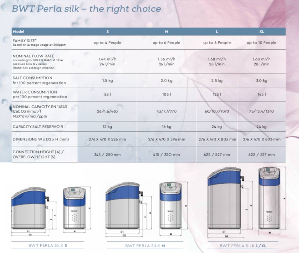 Smart by design, performance driven, tuned for modern living and produces up to 50 litres of silky soft BWT Luxury Water a minute. Matching actual usage, lifestyle patterns and future demands allow the BWT Perla Silk to deliver an uninterrupted supply of softened water. Only regenerating when necessary it optimises the use of water and salt for maximum efficiency and real life running costs, making the BWT Perla Silk the perfect choice to meet the demands of modern living.