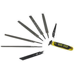• Contents of set: unique quick-change handle, 5 x8” files; round, half round, flat and tri-square all in 2nd cut, plus a rasp, two reciprocating saw blades; 7TPI and 24Tpi and a fabric tool roll