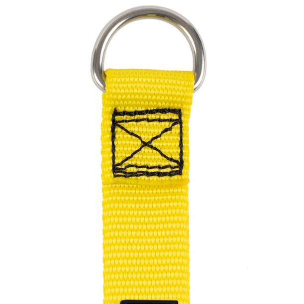 Terminated steel D-ring with reinforced stitching for secure anchoring