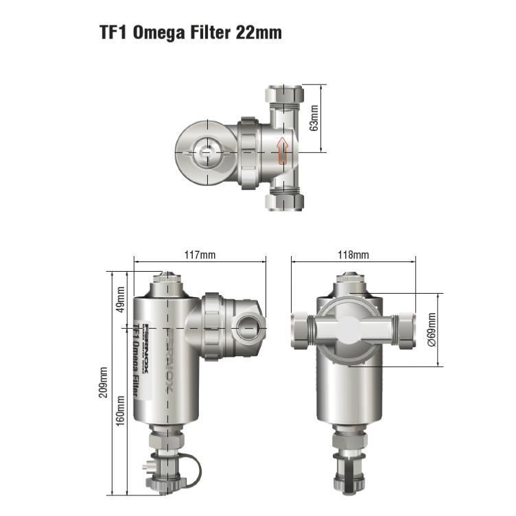 Fernox TF1 Omega 22mm Filter with Slip Socket (No valves) 62248