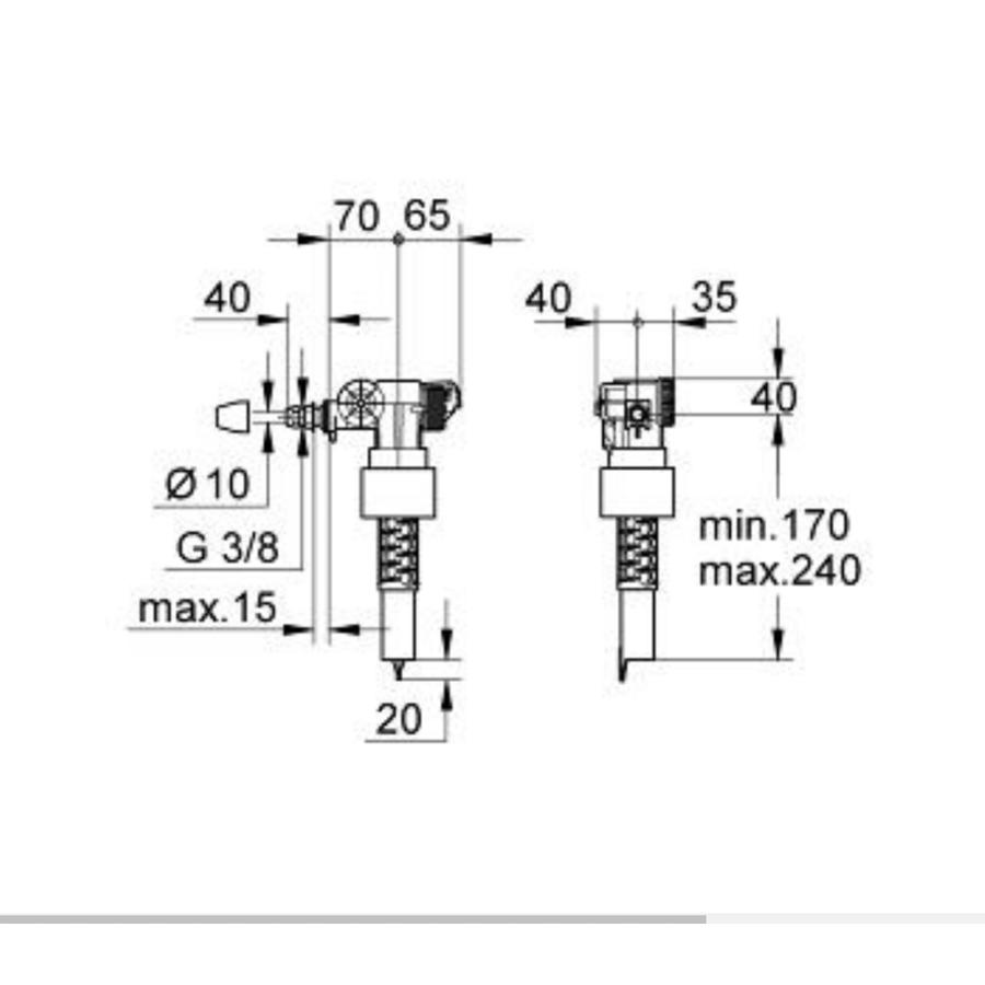 Grohe WC filling valve 37095000 works to supply water into WC cistern. The filling valve, 37095000, has a 3/8 connection, and an adjustable float.