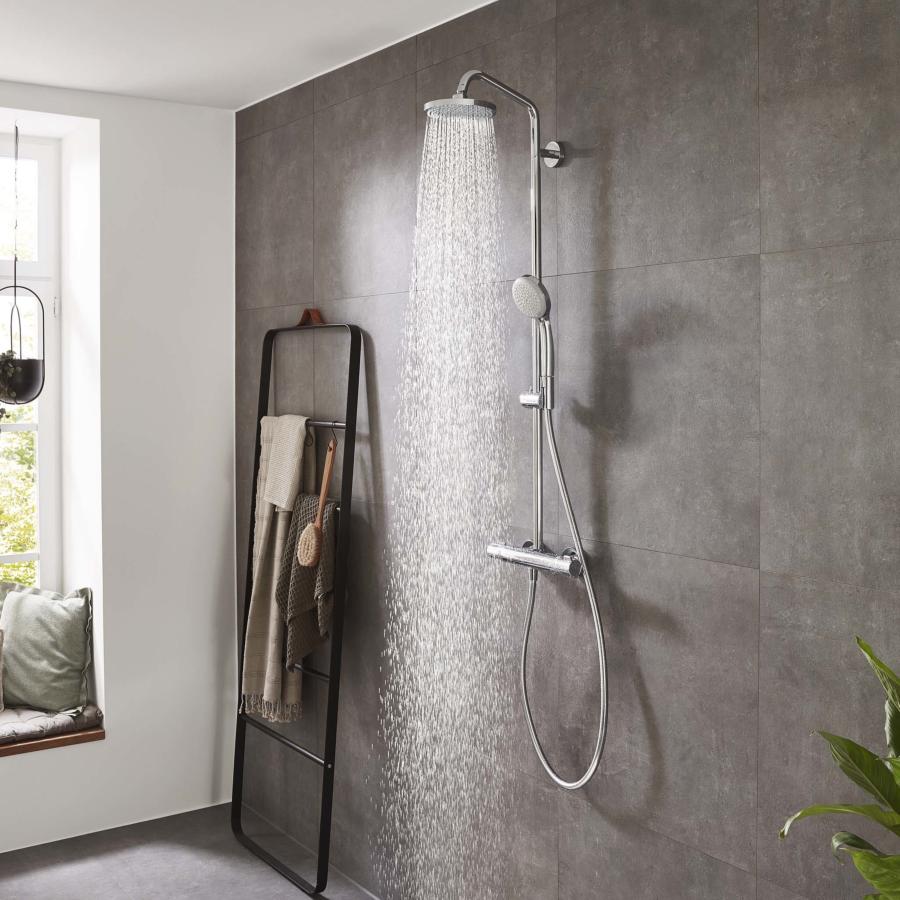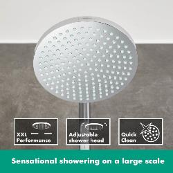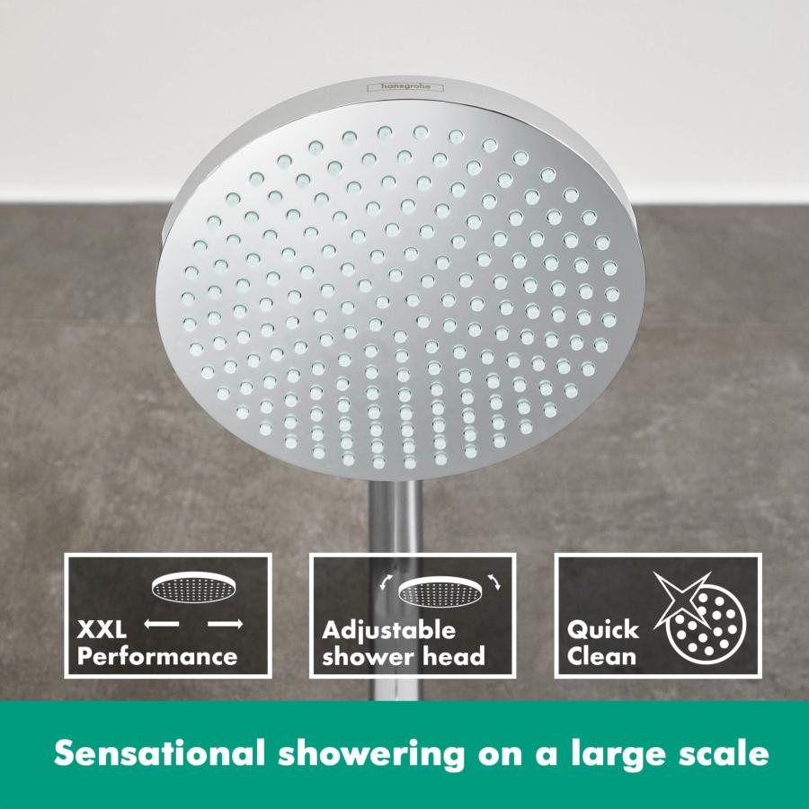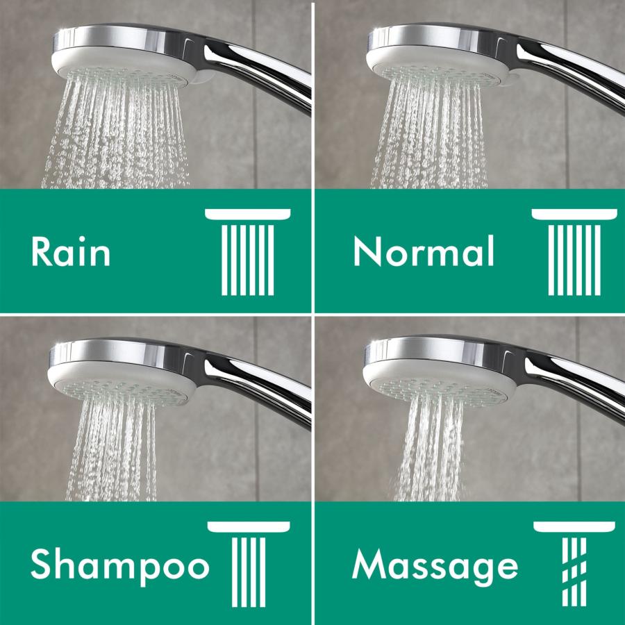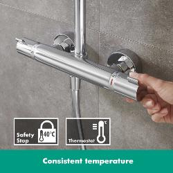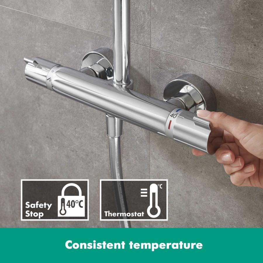 All-round showering comfort. The Croma shower system 160 1spray with thermostat features a large overhead shower that envelops the body with Rain spray. The hand shower enables you to fine tune their shower experience with four hansgrohe spray modes; Rain, Shampoo, Massage and Normal. The Ecostat Comfort Thermostatic mixer keeps the water temperature constant and features SafetyStop to prevent unexpected increases in temperature. The shower surface has QuickClean technology for easy limescale removal.
