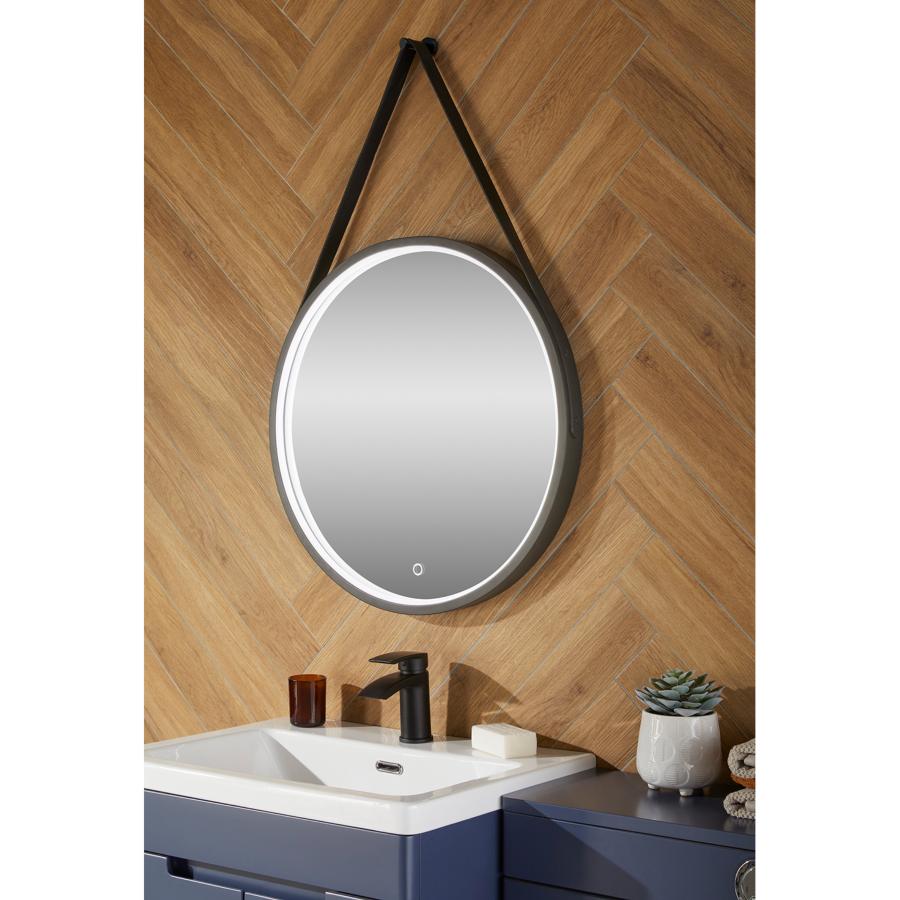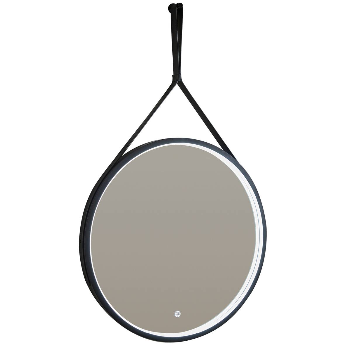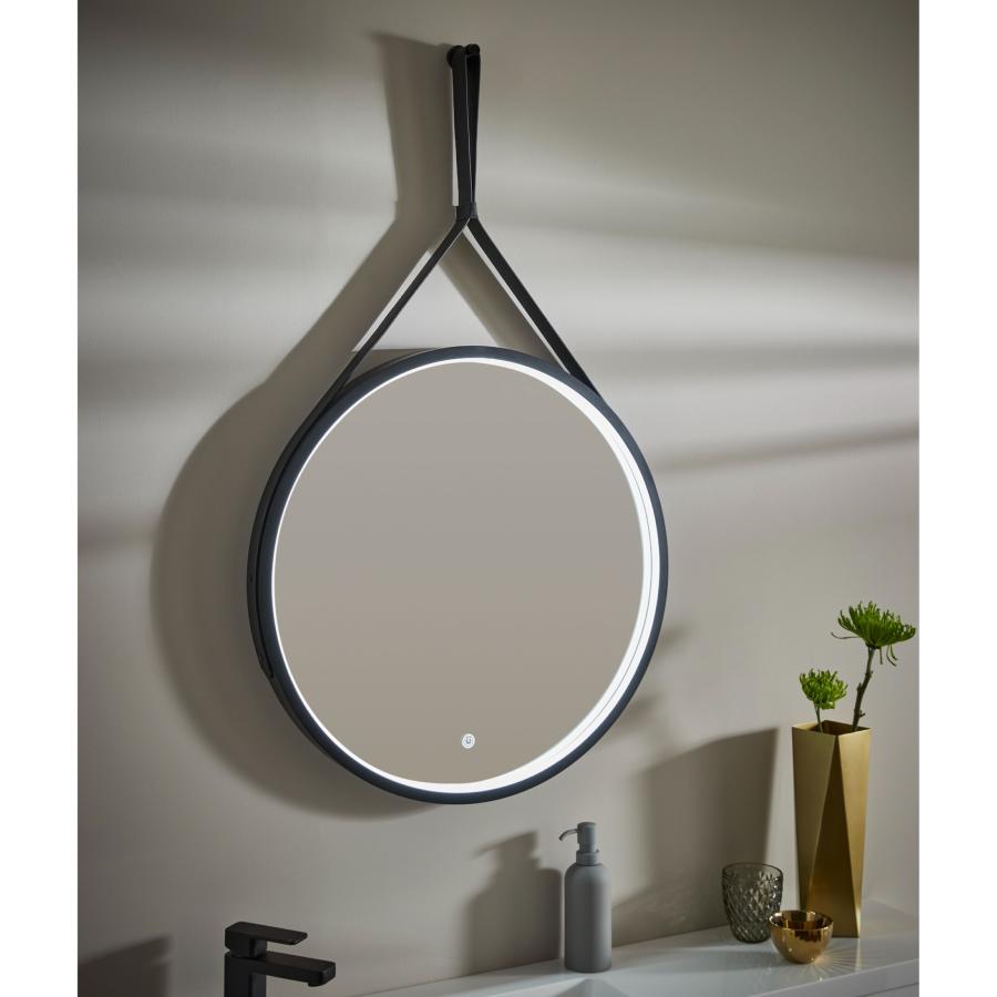 Round 60cm diameter LED mirror with lit edge, Bluetooth and black faux leather surround with a black hanging strap. Featuring a single touch sensor controlling both dimming and on/off functions. Supplied complete with a black wall hanging bracket and adjustable strap loop. The mirror itself attached direct to the wall and the strap can be adjusted to suit any height.