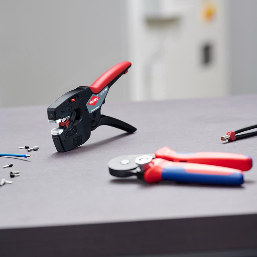 12 72 190 KNIPEX NexStrip® Perfect crimping: fast and even square crimping for individual wire ferrules, the ratchet crimping mechanism guarantees the required crimping pressure. Precise stripping: automatically adapts to the respective cable diameter and ensures consistent stripping lengths with the adjustable length stop especially with repetitive work. Multi-component grips ensure non-slip, comfortable handling. Quick, precise square crimp of single wire ferrules according to DIN 46228 parts 1+4, self-adjusts for sizes 0.25 – 4 mm² / 2 x 2.5 mm² – allows for quick crimping between different sizes. Repetitive, high crimping quality due to ratcheting mechanism with a complete crimping cycle. Stripping with fine adjustment – for optimal adjustment to special materials or temperature conditions for flexible and solid conductors between 0.03 and 10 mm² (AWG 32-8). Clean cut of copper and aluminum conductors fine-stranded up to 10 mm² (AWG 8), solid up to 6 mm² (AWG 10). High-quality housing made of glass fibre reinforced plastic. For the electrical trade: for domestic installations and wiring of electronical devices, such as PLC (programmable logic controller).