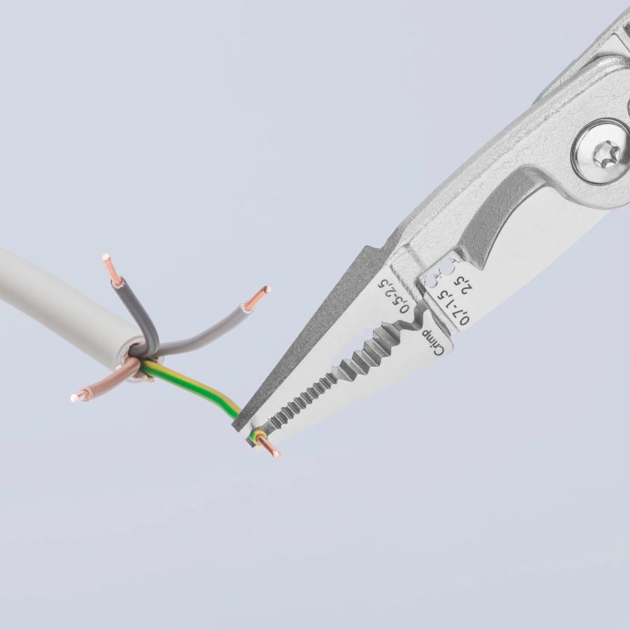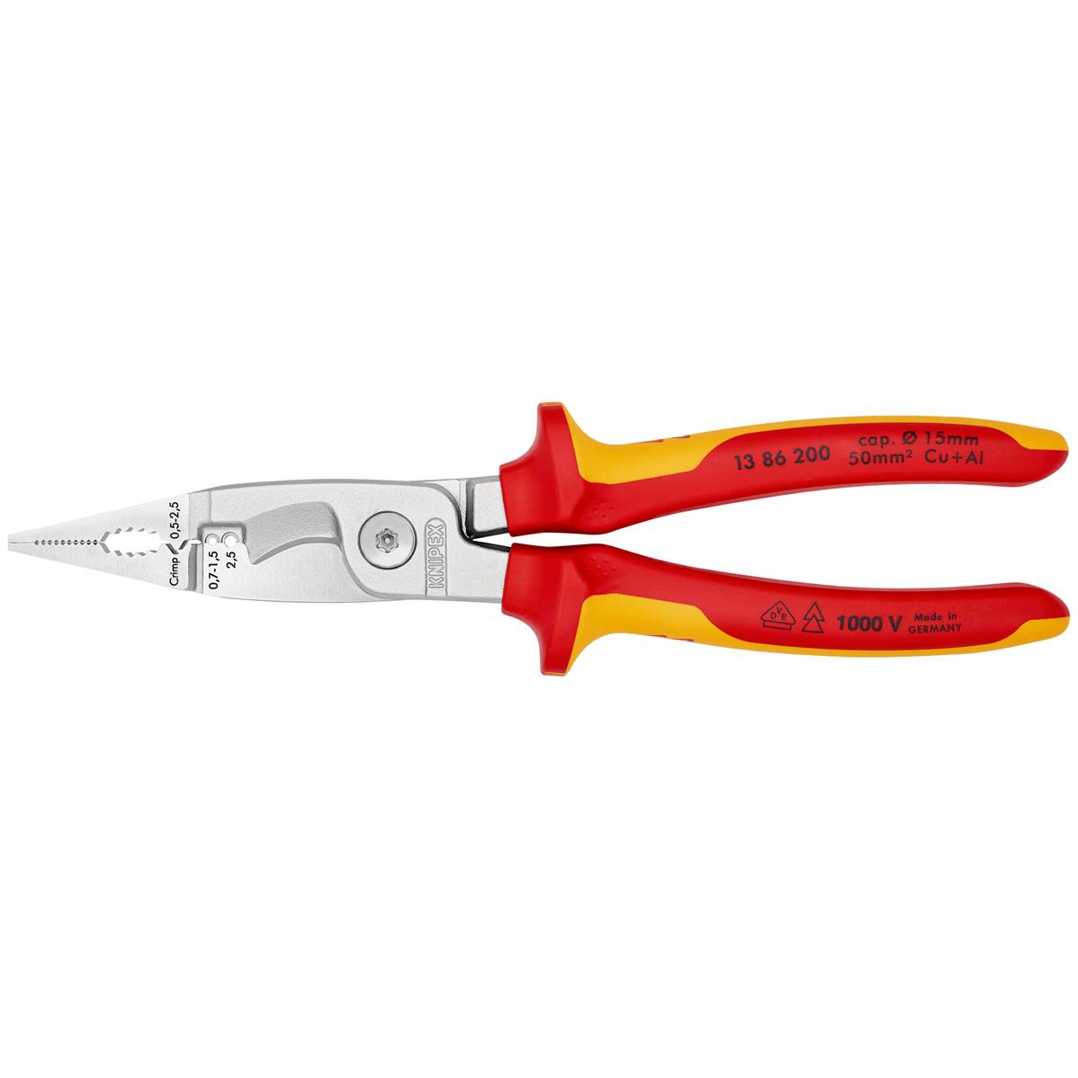 13 86 200 Pliers for Electrical Installation 6 functions in one pair of pliers. to grip flat and round material, for bending, deburring, cutting cable, stripping and crimping wire ferrules. Smooth surfaces near the tips grip single cores without damaging them; serrated gripping surfaces and pipe grip for gripping flat and round material. Clear-cut outside edge on the gripping surfaces for working on flush-mounted junction boxes and deburring feed-through holes. Stripping holes for conductors of 0.75 - 1.5 mm² and 2.5 mm². Crimping die for wire ferrules 0.5 - 2.5 mm². Cable shears with (induction-hardened) precision cutting edges for copper and aluminium cables up to 5 x 2.5 mm² / Ø 15 mm. Slim dimensions for easy access. Bolted joint: precise, zero backlash operation of pliers. - Cutting capacity copper cable, multiple-stranded: Ø 15mm- Cutting capacity copper cable, multiple-stranded: 50mm²- Stripping capacity for single strands: 0.75 — 1.5mm² / 2.5mm²- Capacity in square millimetres: 0.5 — 2.5mm²- AWG: 1 / 0- VDE tested: yes