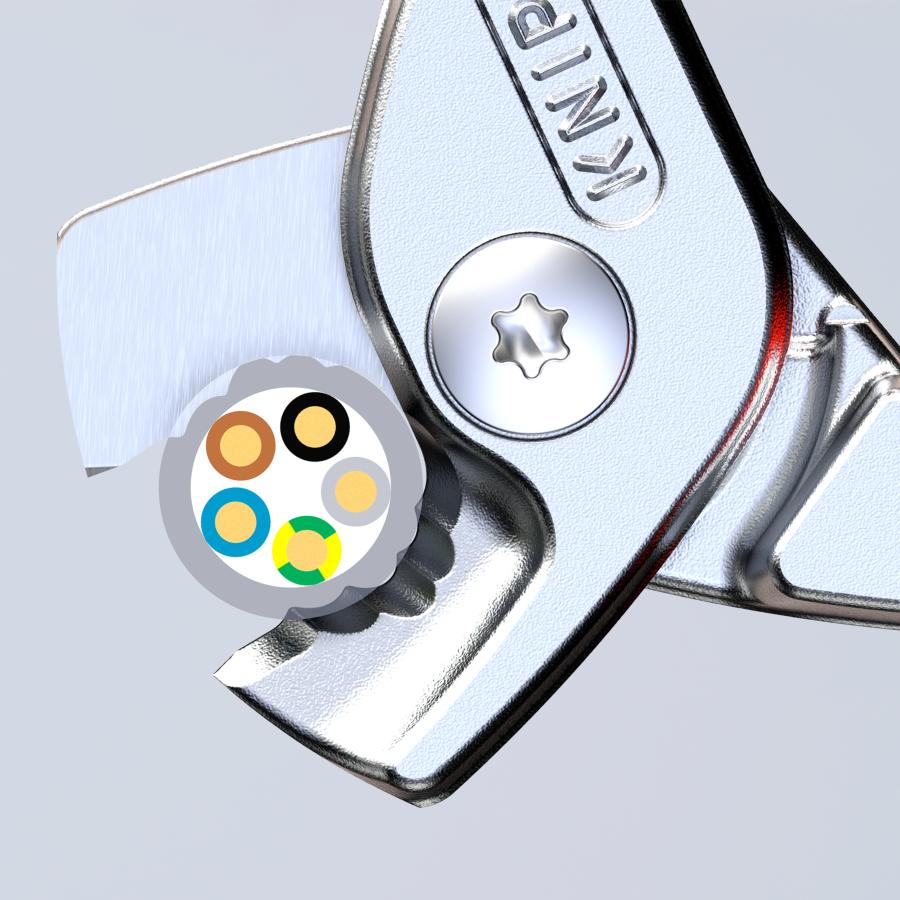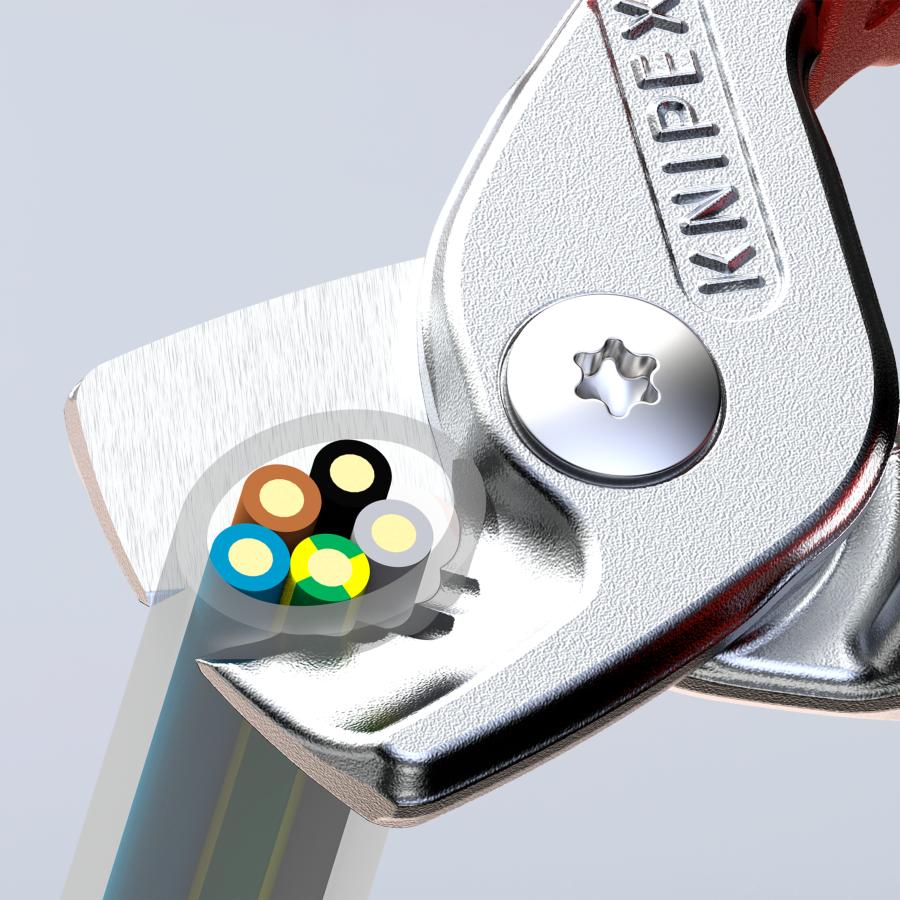95 16 160 KNIPEX StepCut® Small, light, strong: comfortable cutting without crushing and just 160 mm in size. Noticeably less effort: the gradations cut wires one after the other; cutting is up to 40% easier than with standard cable shears of the same length!. Ergonomic handle design: optimal cutting feel even for larger cable diameters. Cuts multi-core stranded copper and aluminium cables up to Ø 15 mm (50 mm²). Cuts solid copper and aluminium cables up to 5 x 4 mm². Cuts without crushing. Bolted joint: precise, effortless, durable. Pinch guard prevents operators' fingers being pinched. Not suitable for steel wire and hard drawn copper conductors. Cutting edges additionally induction-hardened, cutting edge hardness approx. 56 HRC. - Cutting capacity copper cable, multiple-stranded: 50mm²- Cutting capacity copper cable, multiple-stranded: Ø 15mm- AWG: 1 / 0- VDE tested: yes