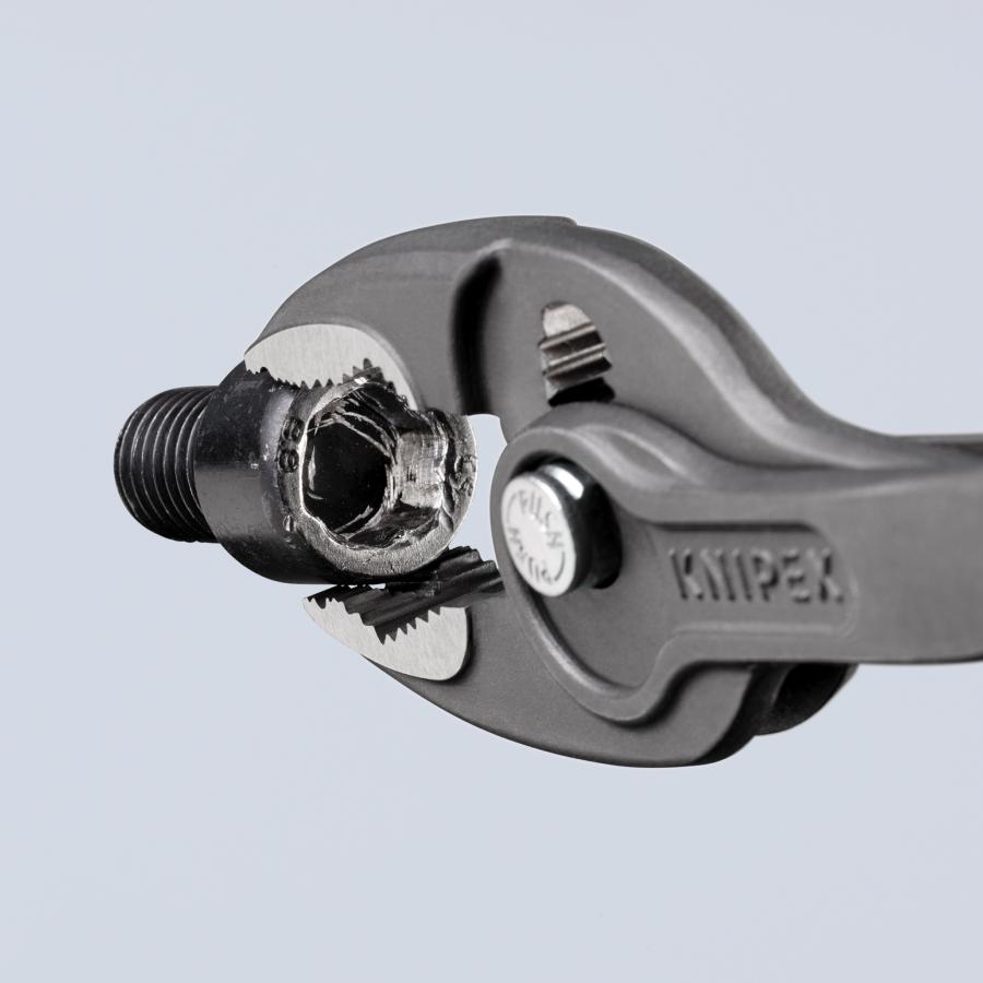 82 01 200 KNIPEX TwinGrip® Gripping, tightening and loosening screws with worn heads and threads. Unique combination: Front grip and side grip function, box joint, push button adjustment. High-grip front jaw with robust teeth and high gear ratio at the tip of the mouth. Very slim pliers let you work even in confined installation spaces with a narrow turning zone for fast results. Pinch stop reduces the risk of crushed fingers. Durable and resilient thanks to robust box joint. The all-rounder for all common tasks. Large front and side gripping capacity for diameters and widths across flats 4 - 22 mm. Reliable, frontal gripping of flat workpieces up to 8 mm thanks to three-point system. Five-way adjustable slip joint with push button adjustment for precise adjustment of gripping capacity. - Adjustment positions: 5- Capacities for pipes (diameter): Ø 5/32 – 7/8in- Capacities for pipes (diameter): Ø 4 – 22mm- Capacities for nuts: 4 – 22mm- Capacities for nuts: 5/32 – 7/8in