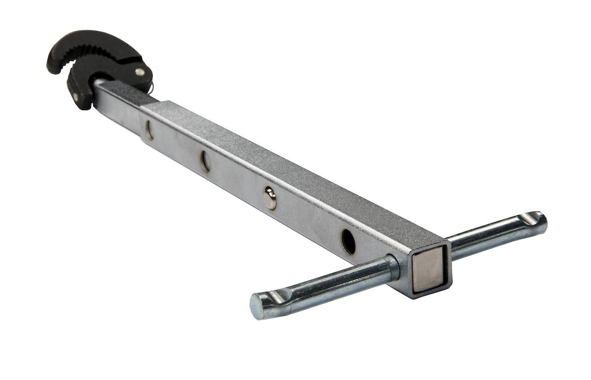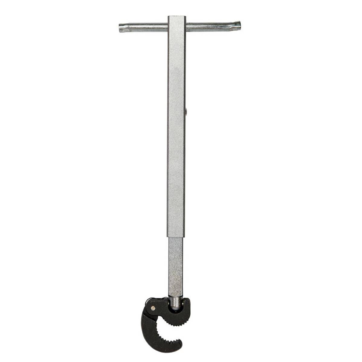 This telescopic basin wrench has 4 length adjustments and the jaw turns through 180 degrees for flexibility. Size 275 to 460mm reach. Jaw capacity up to 32mm.
