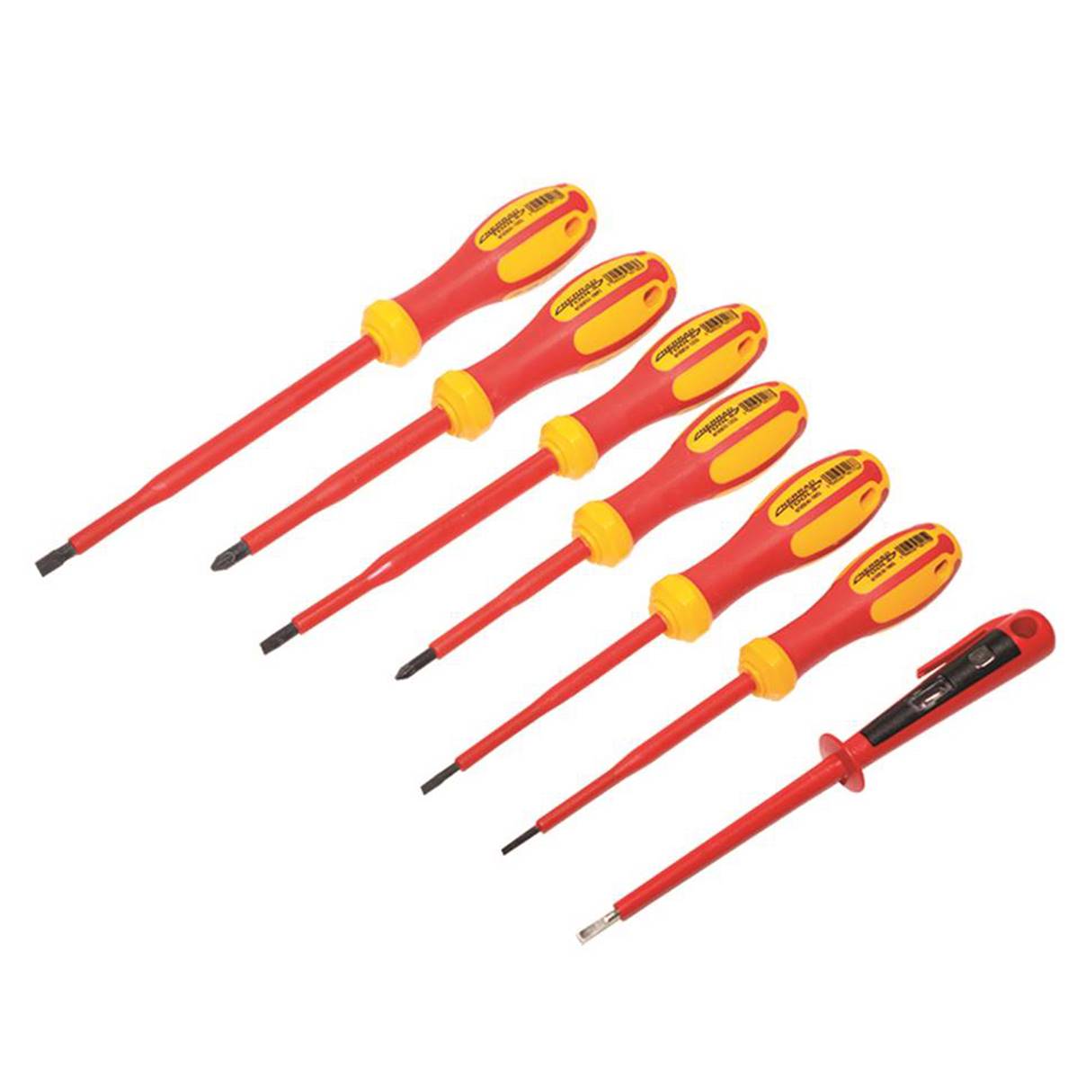 ProGrip VDE Insulated 7 piece screwdriver set featuring ergonomically shaped, dual component handles. Premium quality Chrome Vanadium Molybdenum blades. Precision machined tips. Tip type marking for easy identification. Each tool individually tested to 10,000 Volts to DIN EN60900, IEC norms. VDE Approved for safe use up to 1000v.