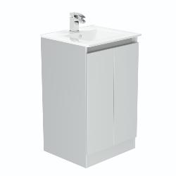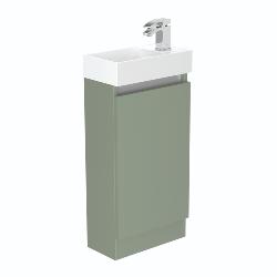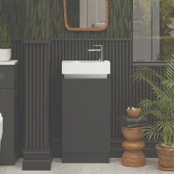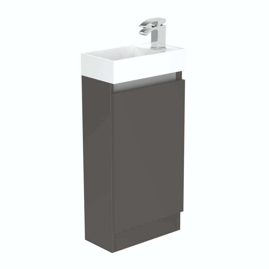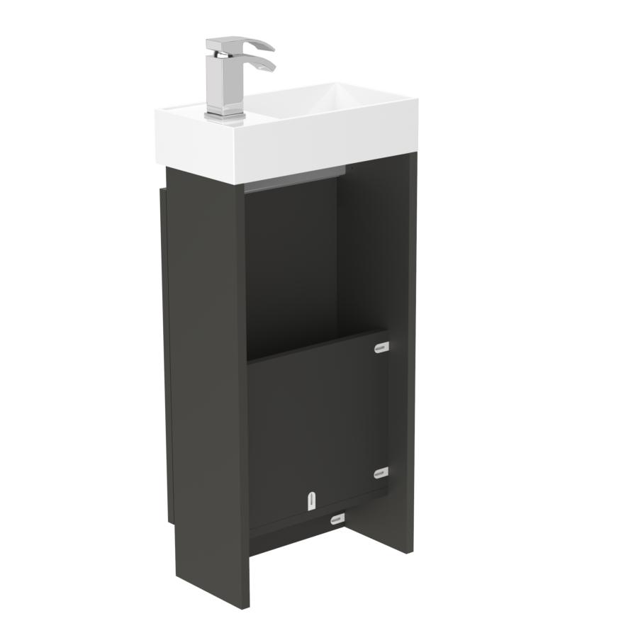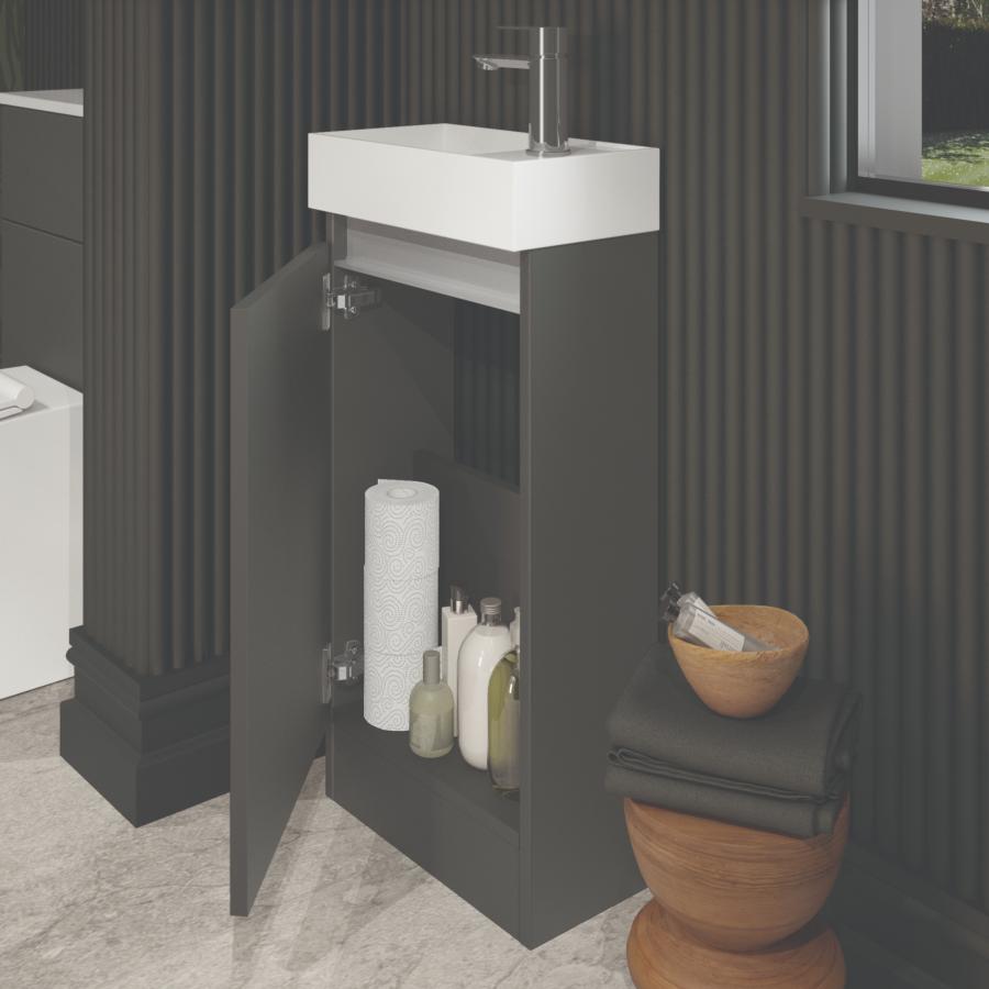 Discover the versatility and style of our compact single door floor standing basin unit, designed specifically for use in cloakrooms or where space is a premium. Its contemporary design, finished in a sleek Midnight Mist, adds a touch of elegance to any small bathroom. The clever reversible feature allows the doors and basin to be adjusted to fit either left or right-handed orientation, providing flexibility in installation. Experience the convenience of the soft-close door, ensuring a whisper-quiet closure every time. This unit is supplied with a ceramic basin, combining functionality with a touch of sophistication. Crafted with meticulous attention to detail in the UK, this exceptional basin unit is proudly made and delivered directly by the manufacturer within a swift 3-day timeframe.