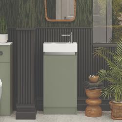 Discover the versatility and style of our compact single door floor standing basin unit, designed specifically for use in cloakrooms or where space is a premium. Its contemporary design, finished in a sleek Sage Green, adds a touch of elegance to any small bathroom. The clever reversible feature allows the doors and basin to be adjusted to fit either left or right-handed orientation, providing flexibility in installation. Experience the convenience of the soft-close door, ensuring a whisper-quiet closure every time. This unit is supplied with a ceramic basin, combining functionality with a touch of sophistication. Crafted with meticulous attention to detail in the UK, this exceptional basin unit is proudly made and delivered directly by the manufacturer within a swift 3-day timeframe.