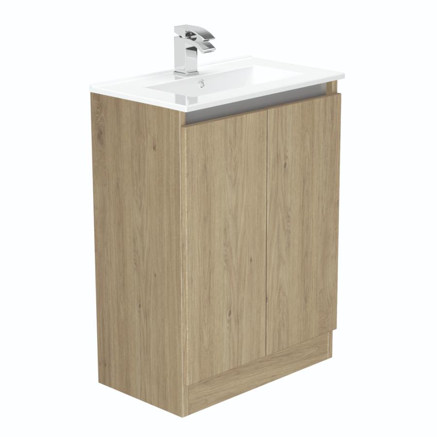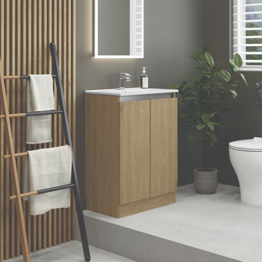 Newland 600mm Slimline Floorstanding Double Door Basin Unit With Ceramic Basin Natural Oak
