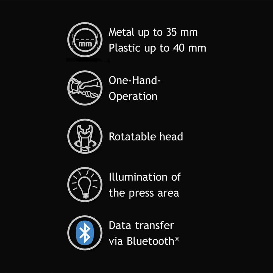Another highlight is the electric retaining bolt lock, which offers additional safety during installation. The integrated pressing point lighting makes it easier to work in poor lighting conditions and, thanks to Bluetooth® technology, you can conveniently call up device-related data via the NovoCheck app. This innovative technology allows you to monitor the performance of your crimping tool and quickly recognise any error messages.
