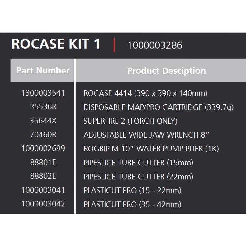 This Rothenberger Rocase Kit contains a Superfire 2 torch, a disposable canister of MAPP gas, a Rogrip M 10" plier, a wide jaw wrench, a pair of 15 & 22mm Pipeslice tube cutters and two Plasticut Pro cutters, all inside a Rocase set. The perfect starter kit for any and all tradesmen!