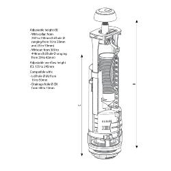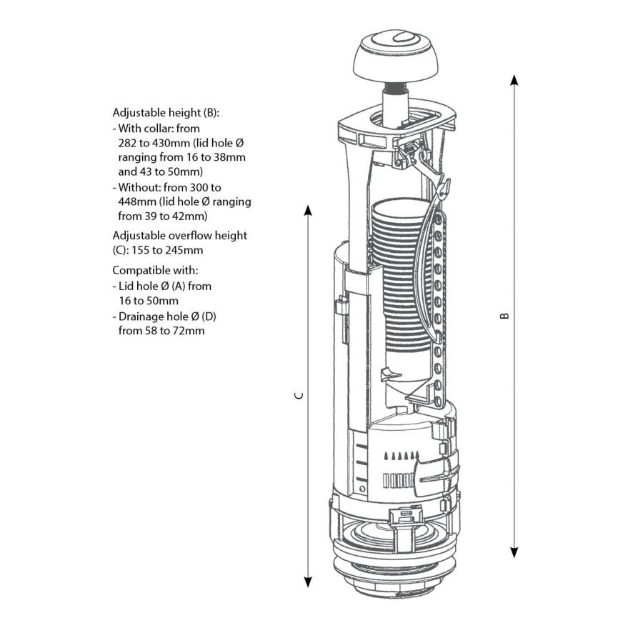 Replacement for any existing SIAMP flush valve is easily maintained without the need to disconnect the cistern from the wc pan, thanks to the universal bayonet which allows the flush valve to be removed from the bayonet with an anti-clockwise 1/4 turn. Height adjustable from 300mm to 448mm; overflow is adjustable between 155mm to 245mm by cutting in increments of 4mm.