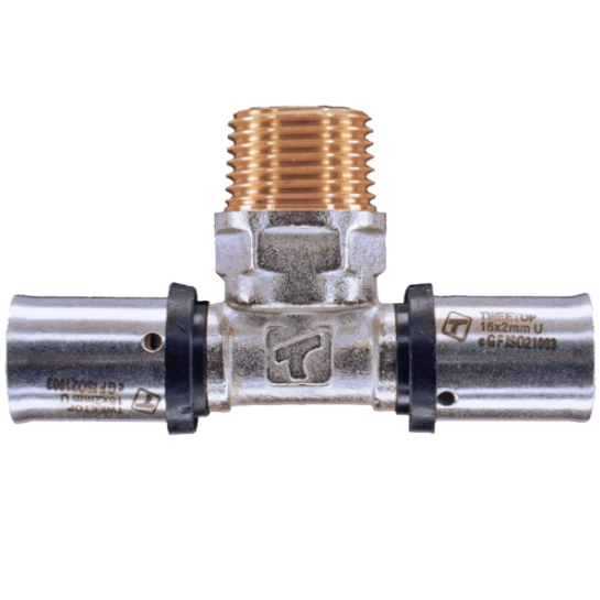 The press tee is used for directional change on a pipe run and can connect pipes of different diameters. The pipe is pressed into the fitting profile in the connection area, with the use of a pressing tool with U-Type jaws. Two O-rings are integrated into the join area to ensure that the connection chamber is guaranteed. Tweetop fittings are resistant to corrosion, produced from pressed type CW617N which is resistant to dezincifaction.