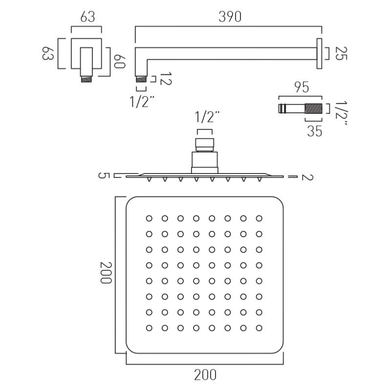 1. Description of Vado Aquablade Square Slimline Shower Head with Arm 200mm (8")AQB-SQ/20/SA/A-C/P: