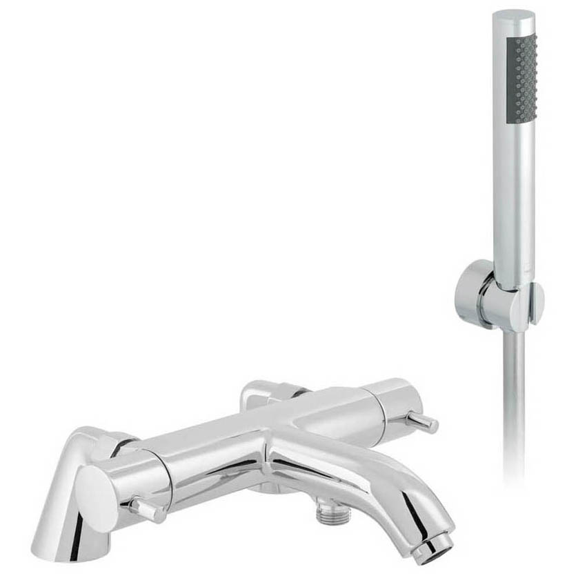 The Vado Celsius Thermostatic Bath Shower Mixer Tap in chrome is a modern, deck-mounted mixer for bathtubs that provides precise temperature control with thermostatic technology to prevent scalding, featuring two deck-mounted levers, a tubular design, and solid brass construction, suitable for high-pressure systems with a 15-year guarantee. It's often sold as the tap only (C/P) or with an optional shower kit (SRK-C/P).