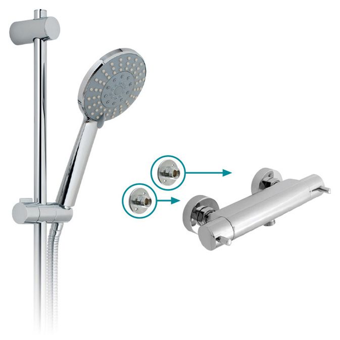 The Vado Celsius Exposed Thermostatic Shower Valve Package features a chrome, round, wall-mounted thermostatic valve, a 1/2" connection, and an Evolve 4-function slide rail kit (handset, hose, rail) suitable for low-pressure systems (0.2 bar minimum). It's a complete, modern shower solution with a 15-year guarantee, designed for reliable performance and a stylish look.
