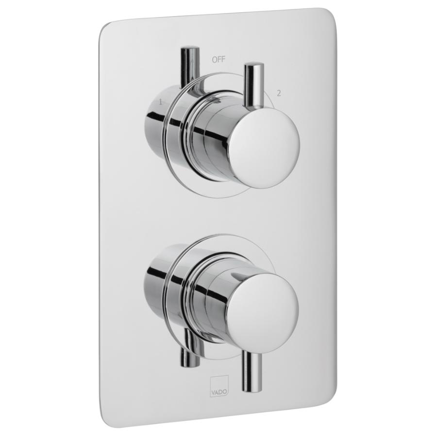 The Vado Celsius 2-Outlet Thermostatic Concealed Shower Valve features a square backplate, two handles for separate flow and temperature control, a durable chrome finish, and designed for wall-mounting to deliver water to two separate shower outlets (like a fixed head and a handset) while maintaining precise temperatures, requiring low minimum pressure for efficient use.