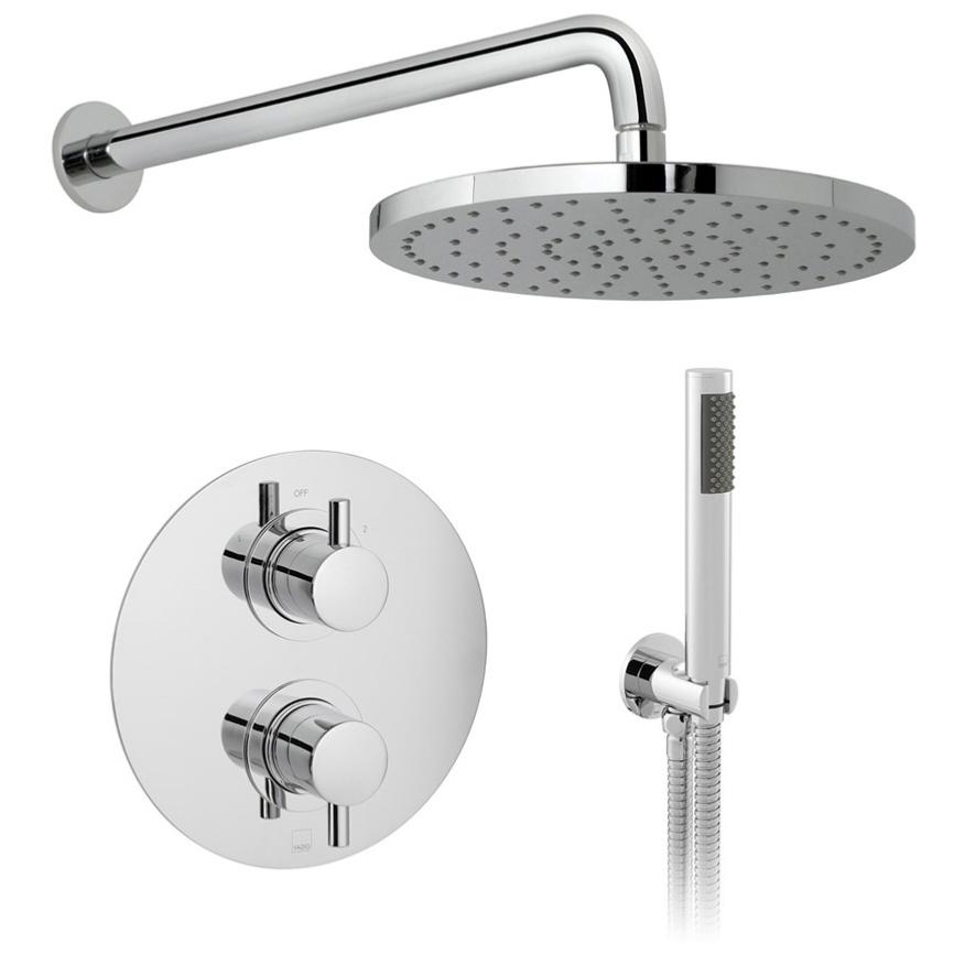 The Vado Celsius 2-Outlet Concealed Thermostatic Shower Package in polished chrome, features a round design with a large Saturn rainfall head, a separate Zoo mini shower kit, and a concealed valve for a modern look, suitable for various plumbing systems, and comes with a 15-year guarantee.