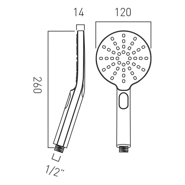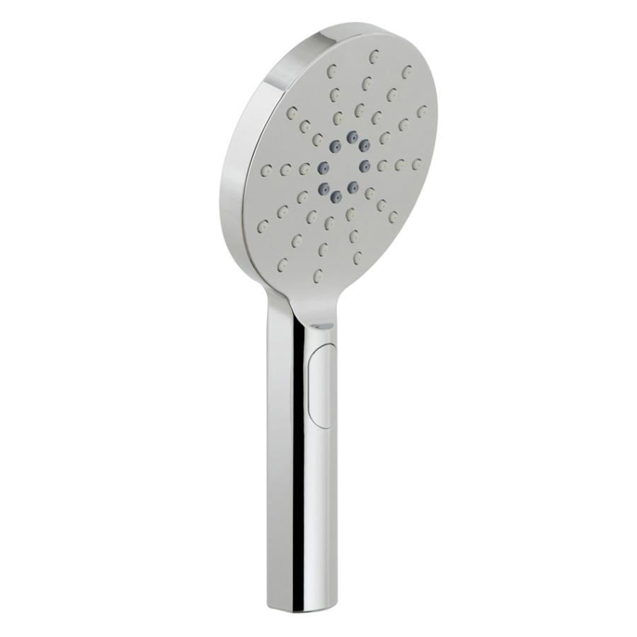 The Vado Nebula 120mm Round 3 Function Shower Handset is a modern, chrome-finished handheld showerhead featuring three spray patterns (rain, intense rain, mist) controlled by a push-button, easy-clean silicone nozzles, and designed for systems with at least 1 bar of pressure. It's a brass construction with a polished chrome finish, offering a sleek look and durable performance, backed by a 15-year guarantee.
