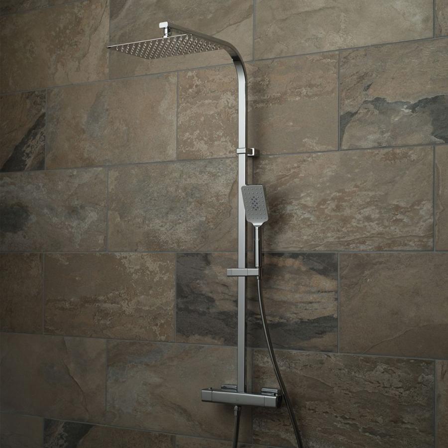 The Vado Phase Adjustable Square Thermostatic Shower Column is a complete shower system featuring a high-shine chrome finish, a square thermostatic valve with diverter, a large rectangular Aquablade shower head, and a square 3-function Nebula handset, designed for easy installation with adjustable depth tolerance and compatibility with various UK pressure systems (min 1.0 bar).