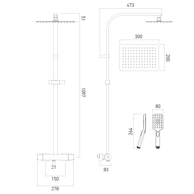 ✔ Shower Head: 300mm x 200mm Aquablade rectangular head.