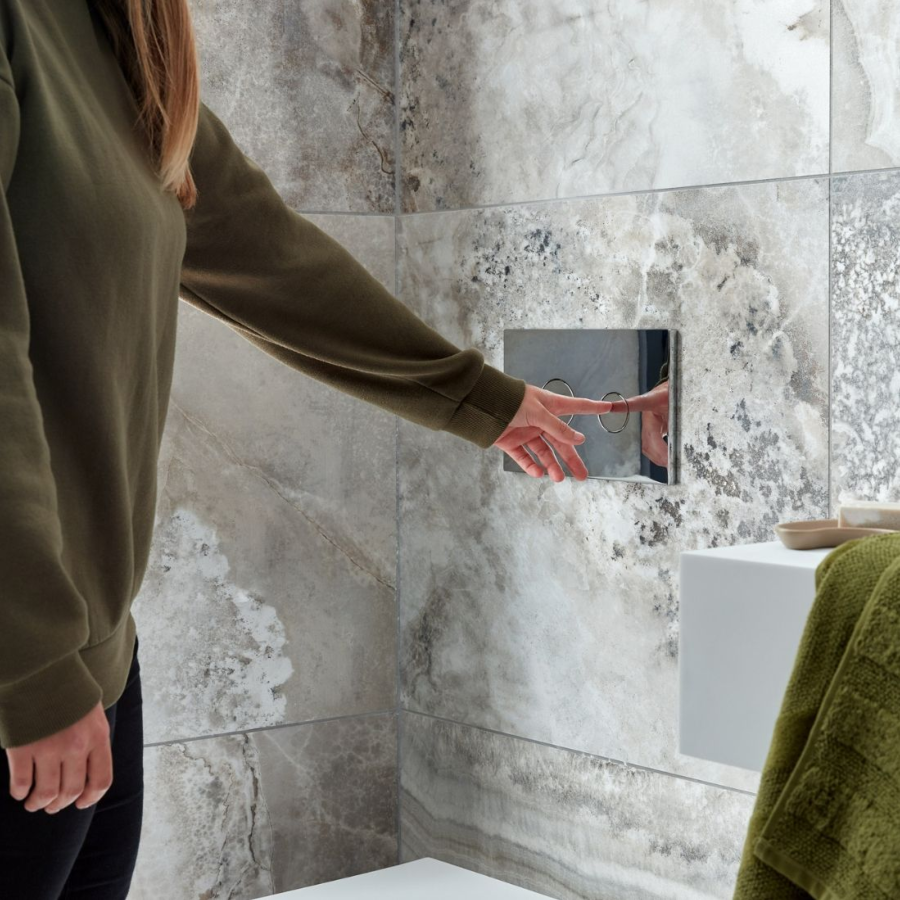 A sleek, contemporary toilet flush plate that pairs with hidden cisterns, offering easy, water-efficient flushing in a stylish chrome finish, explained Vado.