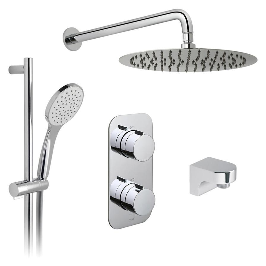 The Vado Tablet Altitude 2 Outlet Thermostatic Shower Set TAB-1720/ALT-AS-CP features a concealed valve, a 300mm Aquablade round shower head with arm, and an Atmosphere slide rail kit with an air-injected handset, allowing simultaneous use of both outlets (All-Flow function) for a versatile, luxurious showering experience with thermostatic temperature control and a 15-year guarantee.