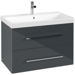 Villeroy & Boch’s Avento Crystal Grey 800mm Wall Hung 2-Drawer Washbasin and Vanity Unit SAVE05B101 is an elegant addition to any bathroom. Featuring two spacious drawers created with a shock-absorbing, soft-close system for a silent and gentle closure every time, this vanity unit provides plenty of storage for all of your bathing needs.