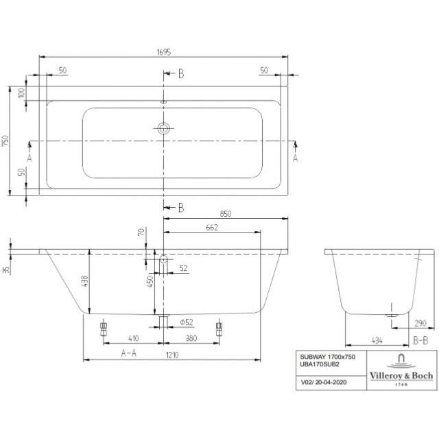 1. Description of Villeroy & Boch Subway Duo Bath 1700 x 750mm White Alpin UBA170SUB2V-01: