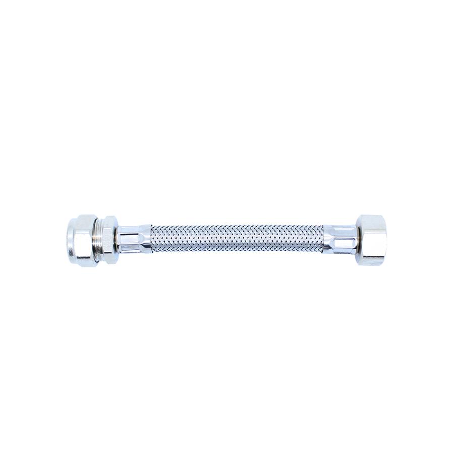 A 150mm long stainless steel braided flexible hose with a 15mm compression fitting at one end and a 1/2" female bsp thread at the other end. This hose has a 10 bar working pressure and a working temperature from -5°C to 90°C.