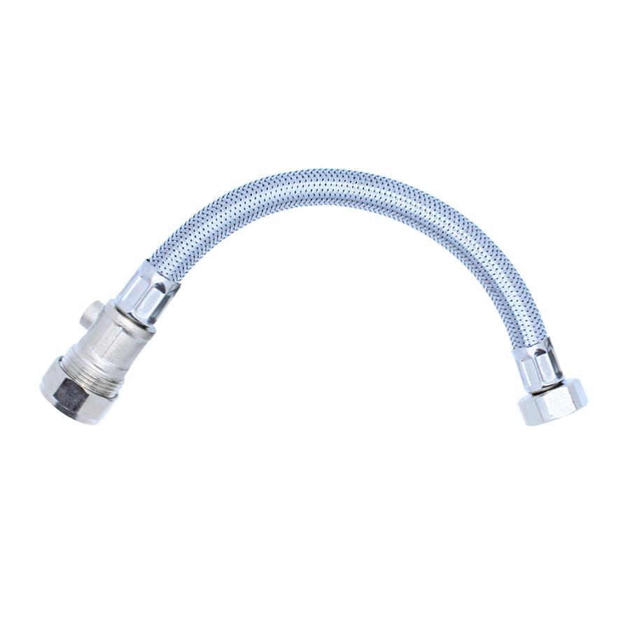 A 300mm long stainless steel braided flexible hose with a 22mm isolator compression fitting at one end and a 3/4" female bsp thread at the other end. This hose has a 10 bar working pressure and a working temperature from -5°C to 90°C.