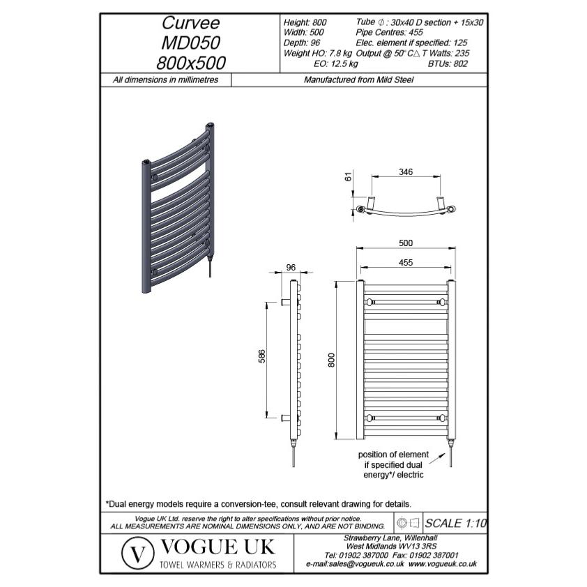 1. Description of Vogue Curvee 800 x 500mm Arched Crossbar Towel Rail - Heating Only (White) MD050 MS0800500WH: