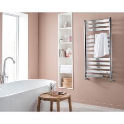 Constructed with steel, this model is an economical and elegant option for any bathroom. The Vogue Vela 950 x 500mm Flat Crossbar Towel Rail (Central Heating only) in a Chrome finish will make a beautiful statement piece that can be used either as direct or indirect heat source.