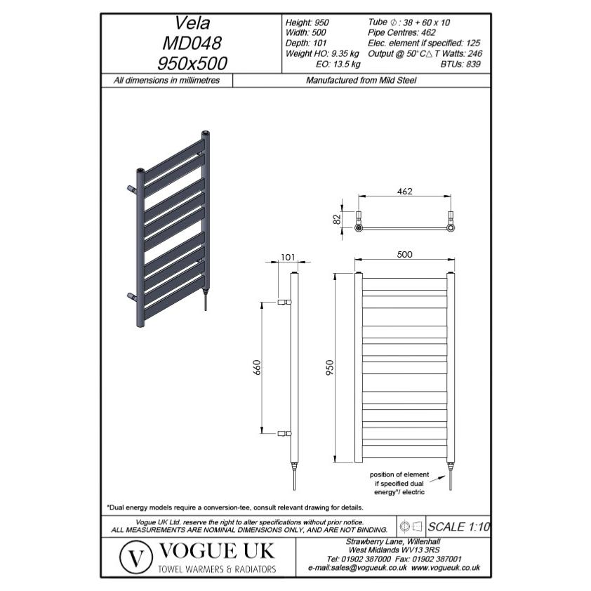 1. Description of Vogue Vela 950 x 500mm Flat Crossbar Towel Rail - Heating Only (Chrome) MD048 MS0950500CP: