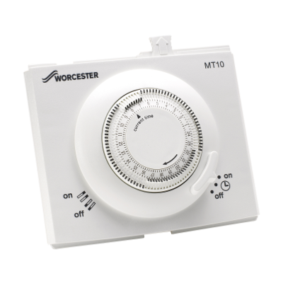 The Worcester Bosch MT10 mechanical timer 7716192036 is a simple to use the control that allows you to set the heating with a start and finish time every day. The start and finish time is set using the 'teeth' on the dial. It is mounted on the boiler. The MT10 can be used in conjunction with the FR10 Intelligent room thermostat to improve the boiler’s fuel efficiency.